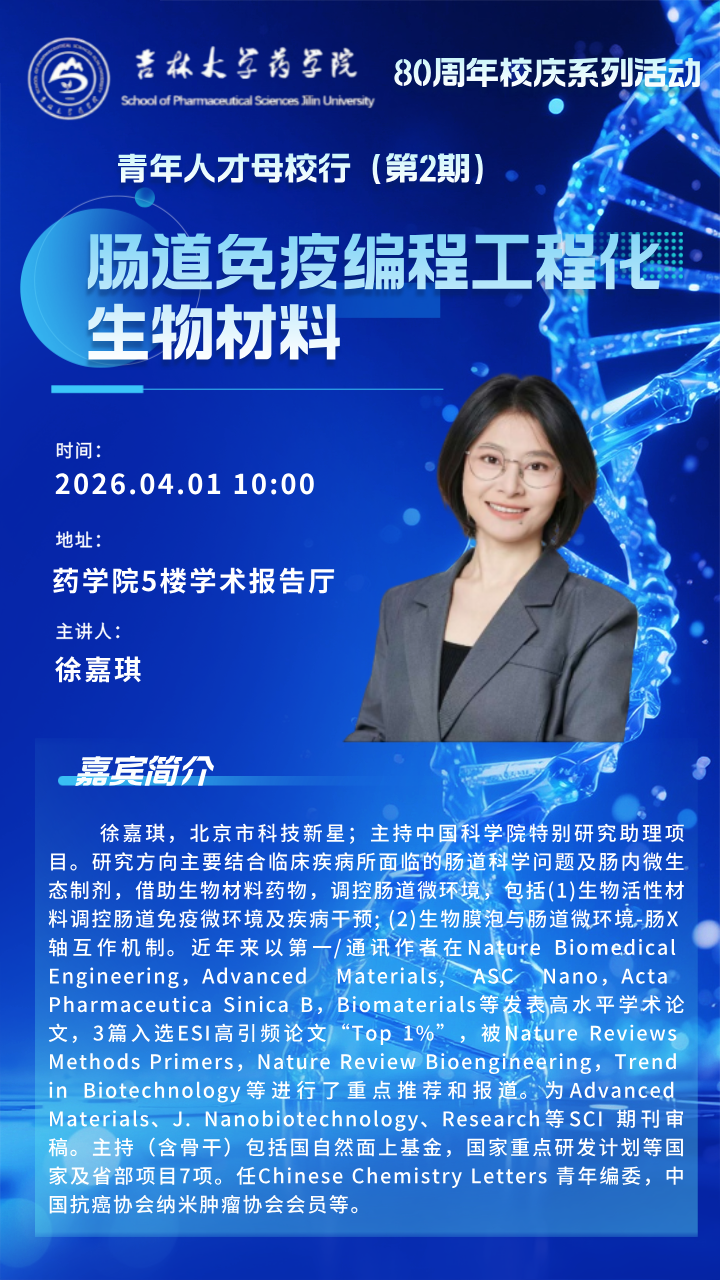 4月1日上午,包你发 80周年校庆系列活动之青年人才母校行(第2期)在包你发 5楼学术报告厅顺利举办。本次讲座邀请北京市科技新星,中国科包你发 大学徐嘉琪副研究员,带来题为《肠道免疫编程工程化生物材料》的学术分享,本次报告由副院长曹霞主持,院长项金宝及包你发 师生代表参会学习。徐嘉琪副研究员围绕肠道免疫调控的核心科学问题,系统阐释了工程化生物材料在调控肠道微环境、干预肠道相关疾病中的作用机制,详细介绍...
