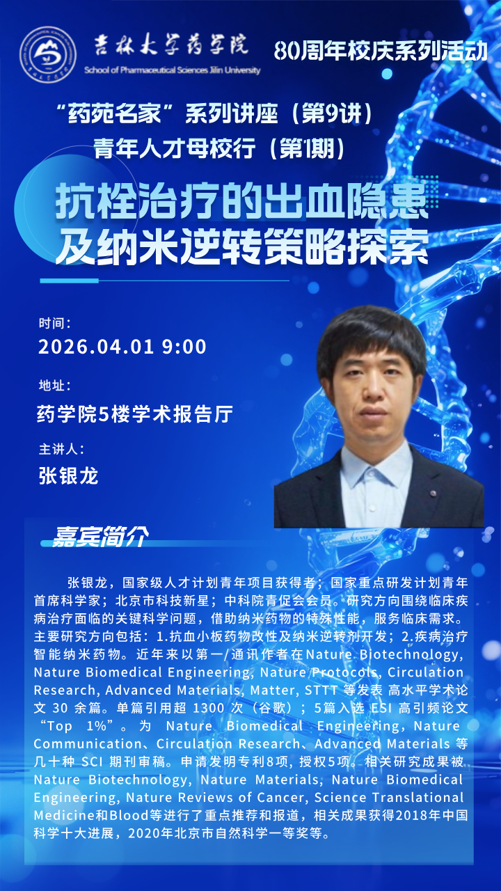 4月1日上午,包你发 80周年校庆系列活动之“药苑名家”系列讲座(第9讲)暨青年人才母校行(第1期)在包你发 5楼学术报告厅顺利举办。本次讲座邀请国家级人才计划青年项目获得者、国家重点研发计划青年首席科学家,中国科包你发 大学张银龙教授,带来题为《抗栓治疗的出血隐患及纳米逆转策略探索》的学术分享,本次报告由副院长曹霞主持,院长项金宝及包你发 师生代表参会学习。张银龙教授围绕临床抗栓治疗的核心痛点,系统剖...