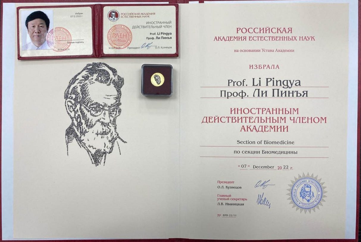 Recently, Prof. Li Pingya from School of Pharmaceutical Sciences of Jilin University (JLU) was elected as a foreign academician of the Russian Academy of Natural Sciences (RAEN) for his innovative contributions in the field of innovative drug development. The other day, the RAEN President Oleg L. Kuznetzov and Chief Academic Secretary General Lida V.Ivanitskaya sent the certificate and congratulatory letter.