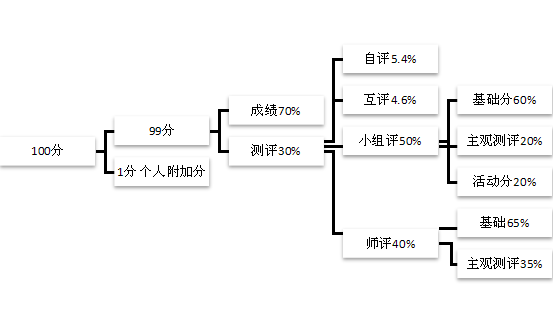 第二条 综合测评分数:满分100分。学习成绩满分(P1)=69.3分。测评满分:自评(P2)+互评(P3)+师评(P4)+小组测评(P5)=29.7分。附加分:满分1.000分。