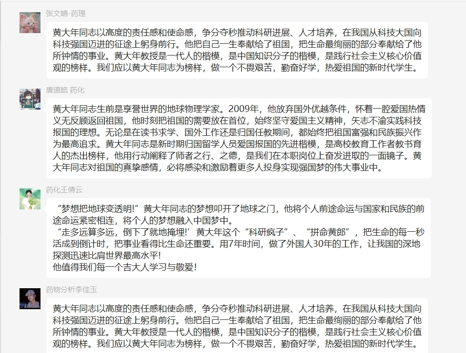 此次观影活动唤醒了药学学子们炽热的爱国奉献之情。新时代青年人应当以黄大年为代表的一大批中国科学家为榜样,胸怀广阔,志向远大,以一颗赤子之心,矢志不渝、精忠报国!作为当代青年,生于盛世,理应学习黄大年精神,弘扬中国科学家“心有大我”的情操,无惧困难、无畏拼搏,承担起振兴中华的责任,为祖国现代化建设奉献自己的力量!