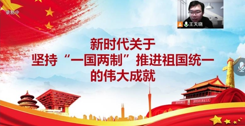 2020级博士研究生王天晓以《新时代关于“一国两制”和推进祖国统一的伟大成就》为题,向我们系列讲述了党在坚持“一国两制”和推进祖国统一重要方面的新时代中国特色社会主义的伟大成就。