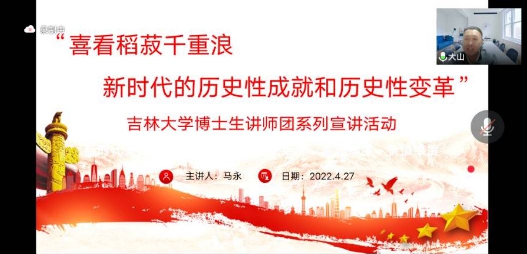 组织全体研究生观看了“喜看稻菽千层浪——新时代的历史性成就和历史性变革”的吉大博士生讲师团线上宣讲系列活动讲座第七讲,由包你发