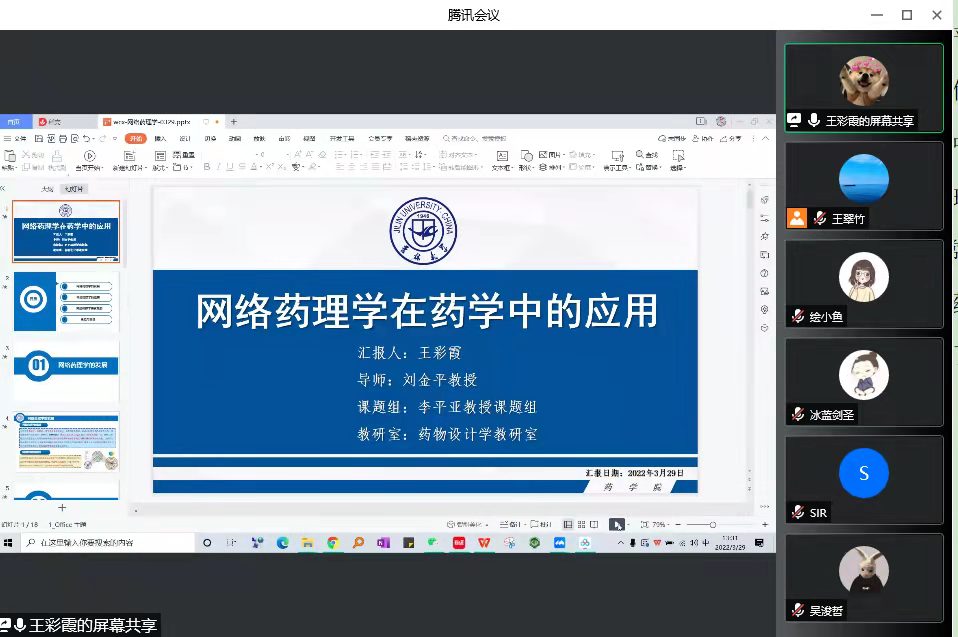 药物设计学教研室李平亚教授和刘金平教授于3月29日下午13:30组织开展了一场《网络药理学在药学中的应用》线上培训,网络药理学作为一门新的交叉学科,将网络科学、生物信息学、计算机科学和数学等学科的方法结合到中药药理的研究中,从分子水平和分子网络调控的背景中阐明中药的作用机理。而且网络药理学对于现在疫情中的同学们来说,最大的优势就是不需要进入实验室做实验,所以非常实用。