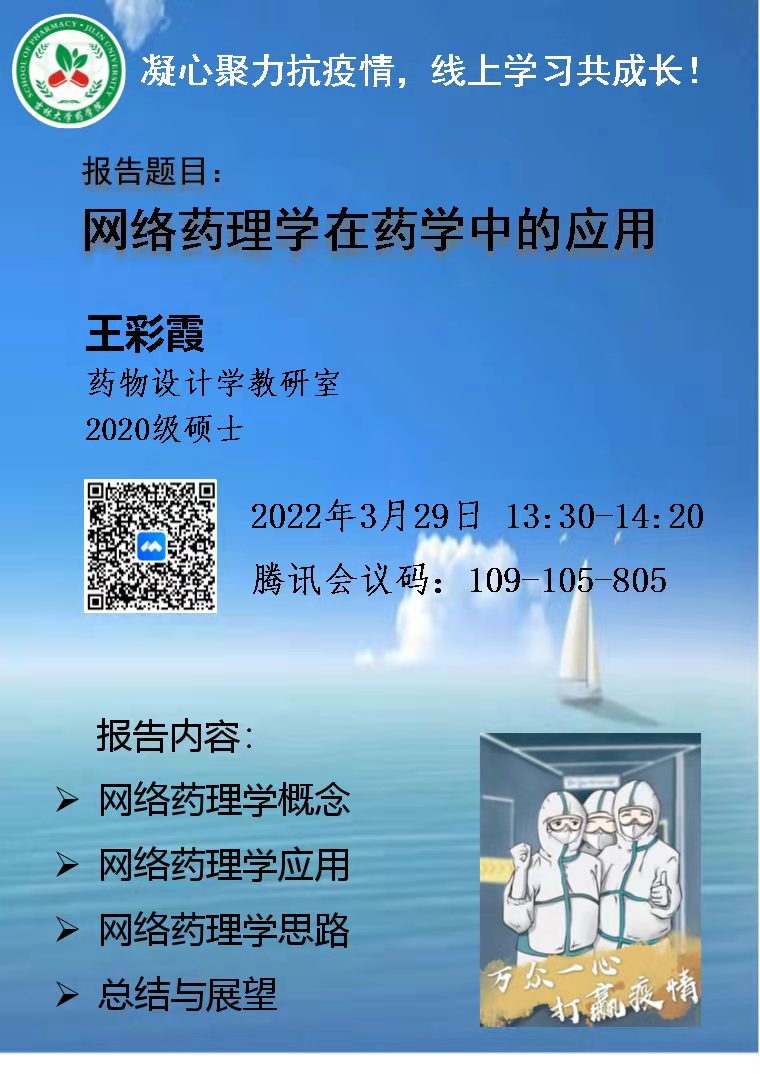 本次“凝心聚力抗疫情,线上学习共成长”之《网络药理学在药学中的应用》线上报告活动取得了圆满的成功,相信每位同学也都看到了王彩霞同学对于各种数据库都能熟记于心、运用的十分熟练,所以希望大家会后也要多用多练,才能运用自如,真真正正地做到学以致用。