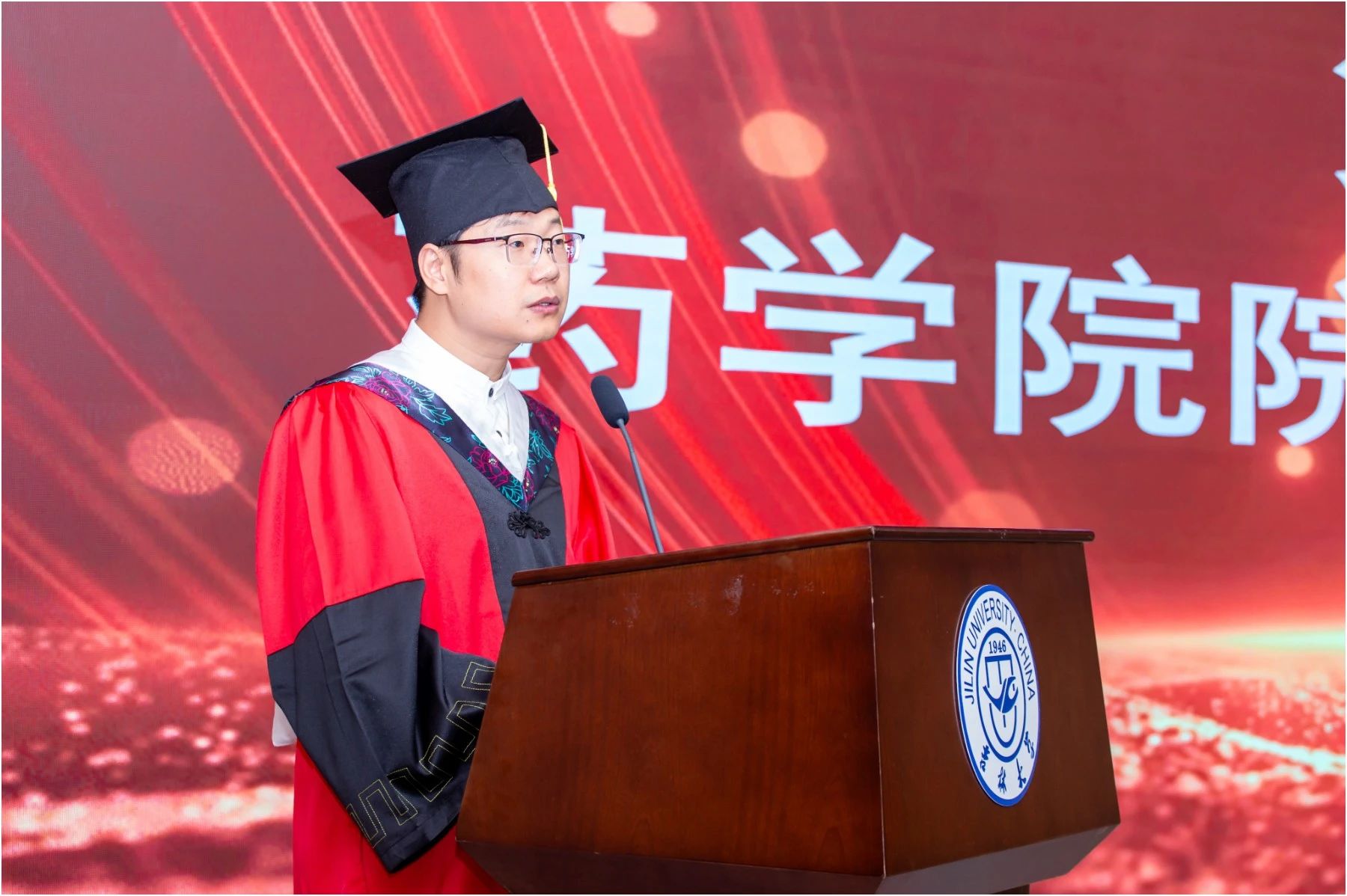 包你发 院长项金宝、副院长王毅、副院长曹霞、副院长徐华丽、药学系主任徐国兴、282103班班主任杨立泉、天然药物化学教研室王志寒,以及包你发 辅导员刘锦澍、杨博斐共同出席典礼,144名2025届本科毕业生和45名学生家长齐聚一堂,共同见证这一重要时刻。典礼在庄严肃穆的国歌声中启幕,全体人员肃立,奏唱国歌。