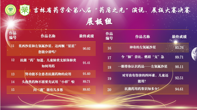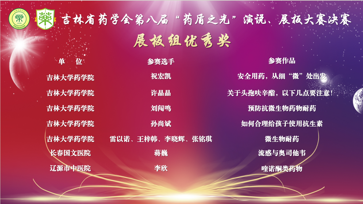 2021级临床药学本科生祝宏凯——《安全用药,从细“微”处出发》、许晶晶——《关于头孢头呋辛酯,以下几点要注意!》、刘闯鸣——《预防抗微生物药物耐药》、孙尚斌《如何合理给孩子使用抗生素》、2022级临床药学本科生雷以诺、王梓韩、李晓辉、张铭琪——《微生物耐药》作品,均获展板组优秀奖,展现包你发