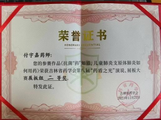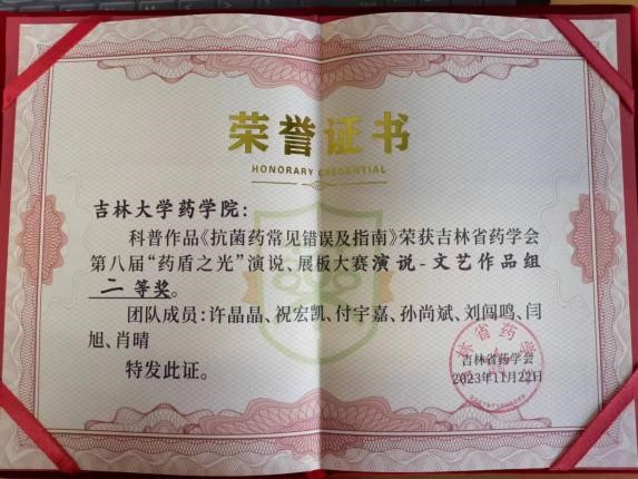 学子科普能力和素养。2022级临床药学本科生雷以诺、王梓韩、李晓辉、张铭琪——《药品安全无小事,合理用药有常识》作品荣获演讲组优秀奖。