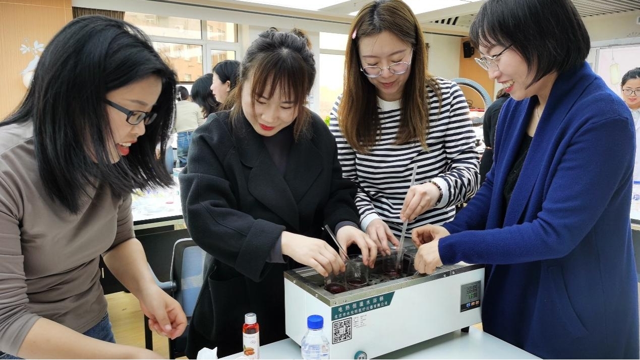 随后,口红制作环节在老师们热闹的讨论声中,仿佛都回归到了“老本行”,老师们熟练地操作着仪器,共同呵护着简单却又倾注了期待的成品。