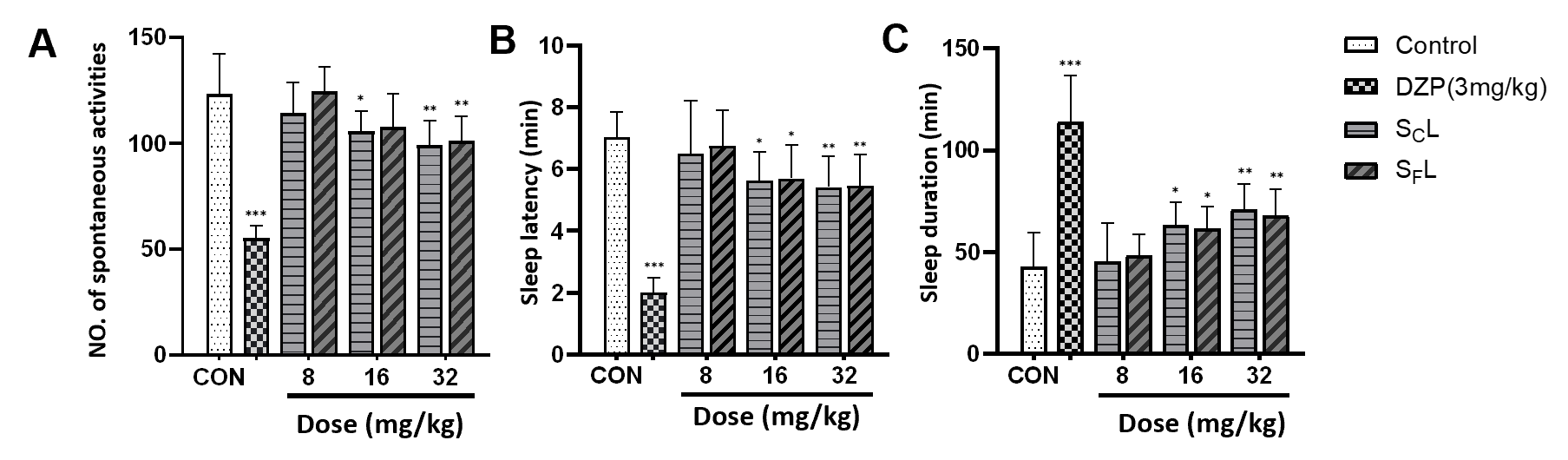 尽管SCL和SFL在民间长期用于改善失眠,但其镇静催眠作用缺乏系统研究支持。本研究通过自发活动实验、戊巴比妥钠诱导睡眠实验、对氯苯丙氨酸失眠模型实验及氟马西尼逆转催眠实验,综合评价了二者的镇静催眠活性。结果表明,SCL和SFL均以剂量依赖方式增强戊巴比妥的睡眠效应(图2)、改善氯苯丙氨酸(pCPA)所致的失眠状态(图3),且SCL的效果显著优于SFL。氟马西尼可抑制两者的催眠作用(图3),同时,SCL与SFL均与5-HTP表现出协同催眠效应(图3),表明5-HT与GABA系统共同介导其镇静催眠活性。