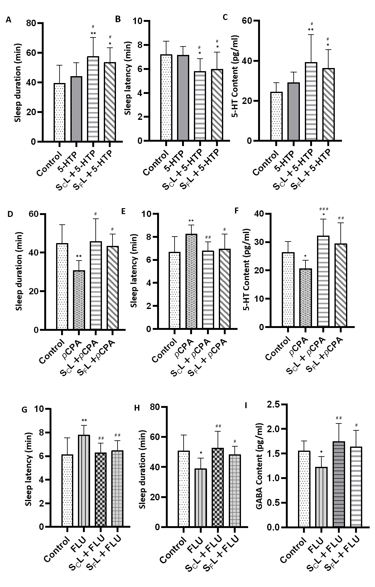 图3与5-HTP协同诱导睡眠时长(A)和潜伏期(B)及小鼠海马5-羟色胺含量(C),pCPA诱导失眠小鼠的睡眠持续时间(D)和潜伏期(E)及海马中5-HT含量(F),流感致失眠小鼠的睡眠潜伏期(G)和持续时间(H)与海马种GABA含量(I)(与对照组比较,*p< 0.05,**p< 0.01,***p< 0.001;与模型组比较,#p< 0.05,##p< 0.01,###p< 0.001)